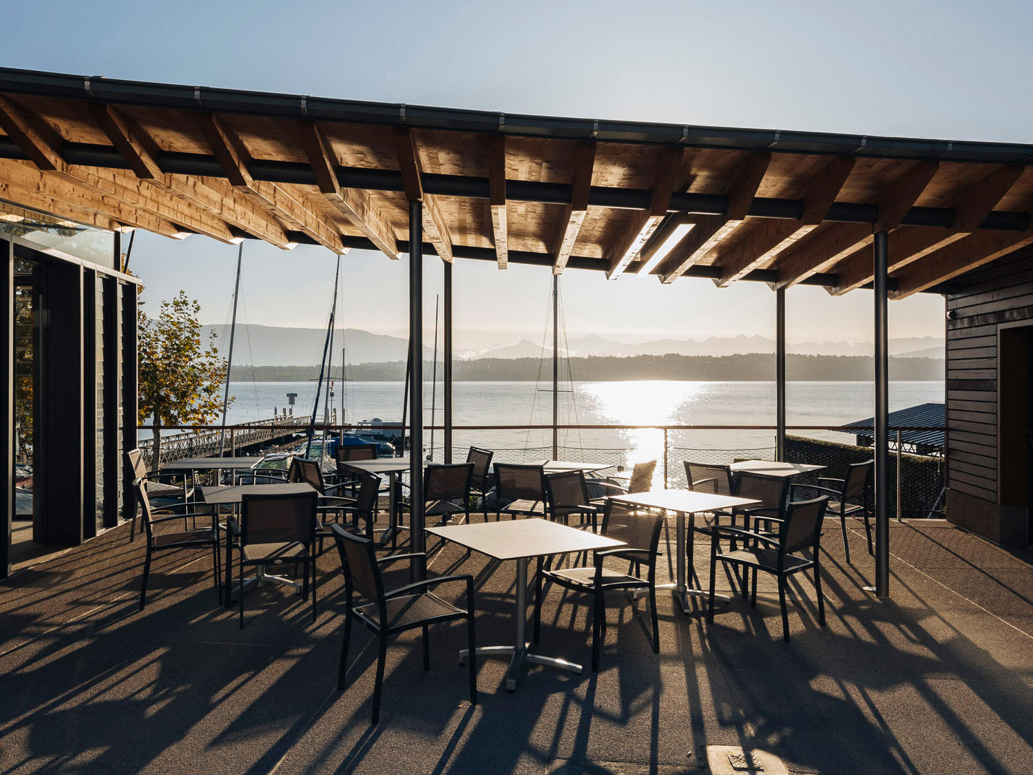 En arrivant sur place, vous verrez dans un premier temps la buvette du CNBe, un espace chaleureux et accueillant, ouvert à tous (membres et non membres). Une cinquantaine de places y sont disponibles. Vous pourrez y déguster de bons repas ou tout simplement y boire un verre en contemplant le panorama, une vue imprenable sur le Lac Léman et le Mont-Blanc.